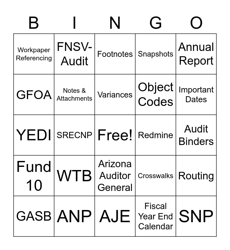 This bingo card has a free space and 25 words: WTB, AJE, Variances, GASB, Annual Report, Workpaper Referencing, GFOA, FNSV-Audit, Redmine, Arizona Auditor General, Object Codes, YEDI, Crosswalks, Routing, Notes & Attachments, Pending Entries, Audit Binders, Footnotes, Important Dates, SRECNP, SNP, ANP, Fund 10, Snapshots and Fiscal Year End Calendar.