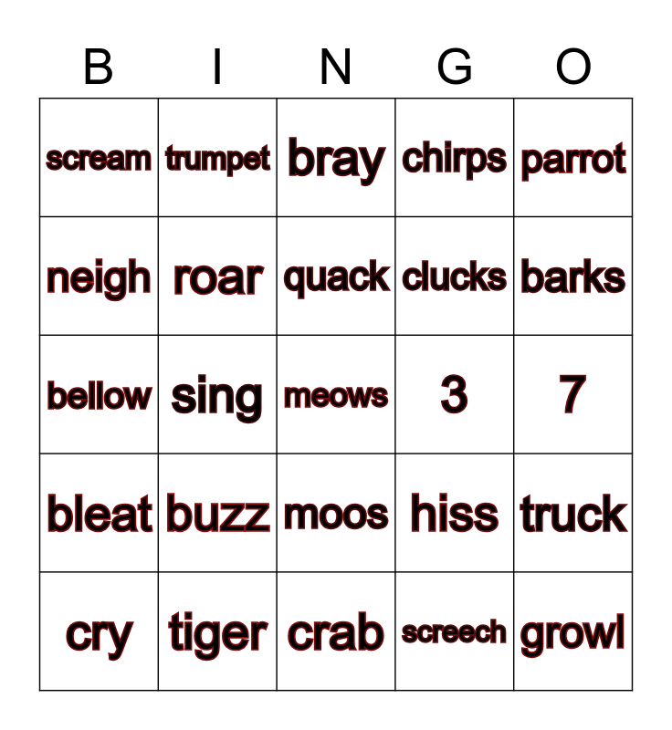 This bingo card has a free space and 24 words: buzz, tiger, quack, cry, parrot, scream, neigh, trumpet, 3, moos, clucks, bellow, hiss, truck, roar, screech, 7, bray, barks, sing, growl, bleat, chirps and crab.