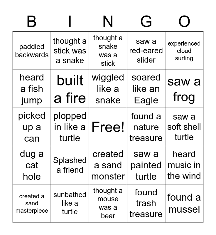 This bingo card has a free space and 24 words: Splashed a friend, sunbathed like a turtle, wiggled like a snake, created a sand masterpiece, experienced cloud surfing, paddled backwards, heard a fish jump, thought a stick was a snake, found a nature treasure, created a sand monster, soared like an Eagle, picked up a can, saw a painted turtle, heard music in the wind, built a fire, found trash treasure, saw a soft shell turtle, thought a snake was a stick, saw a frog, plopped in like a turtle, found a mussel, dug a cat hole, saw a red-eared slider and thought a mouse was a bear.