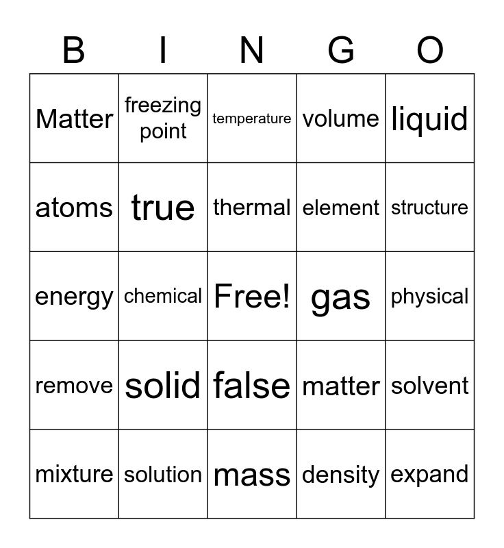This bingo card has a free space and 24 words: solid, solution, thermal, mixture, liquid, Matter, atoms, freezing point, gas, false, element, energy, matter, solvent, true, density, physical, temperature, structure, chemical, expand, remove, volume and mass.
