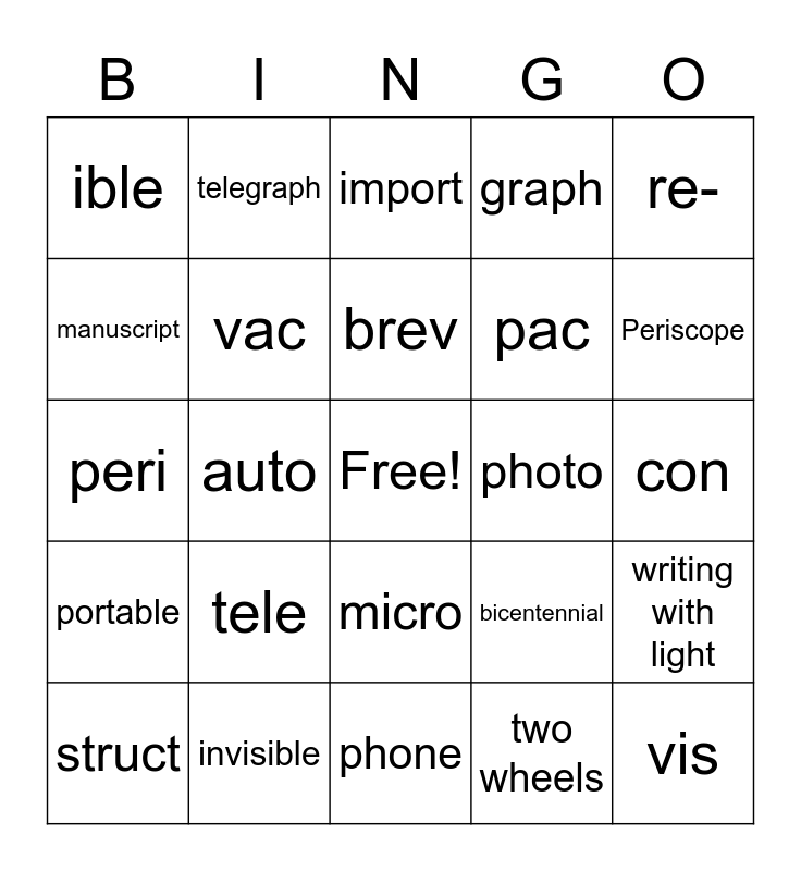 This bingo card has a free space and 44 words: port, vis, mem, struct, unicycle, two wheels, import, to become one, re-, invisible, graph, photo, micro, tele, scope, phone, auto, peri, biography, Periscope, telegraph, microscope, export, ible, memorize, con, life, 100 year anniversary, bicentennial, portable, telescope, writing with light, construct, im, auto, geo, anti, chrono, brev, manuscript, pac, sens, vac and dict.