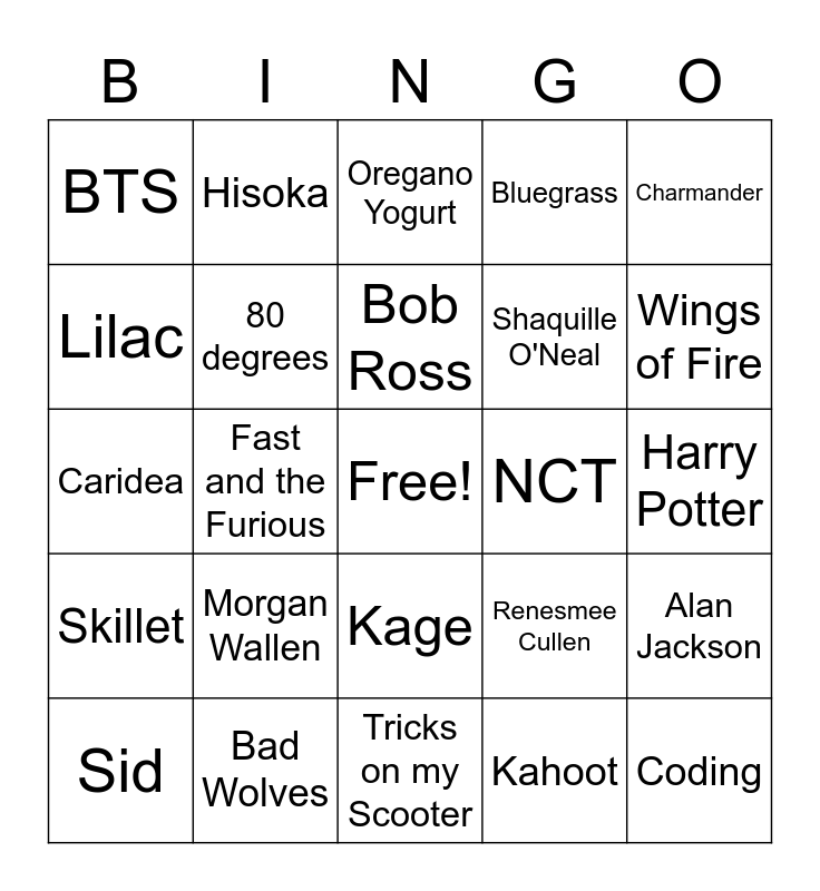 This bingo card has a free space and 24 words: Morgan Wallen, Bad Wolves, Bob Ross, Sid, Charmander, BTS, Lilac, Hisoka, NCT, Kage, Shaquille O'Neal, Caridea, Renesmee Cullen, Alan Jackson, 80 degrees, Kahoot, Harry Potter, Oregano Yogurt, Wings of Fire, Fast and the Furious, Coding, Skillet, Bluegrass and Tricks on my Scooter.