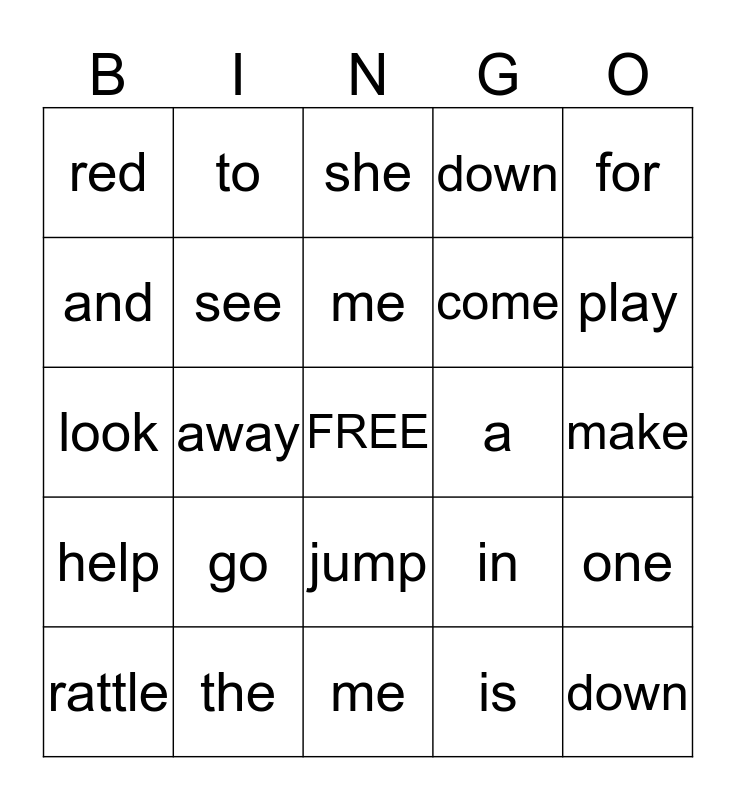 This bingo card has a free space and 24 words: go, the, me, rattle, for, red, and, to, a, jump, come, look, in, one, see, is, make, she, play, away, down, help, down and me.
