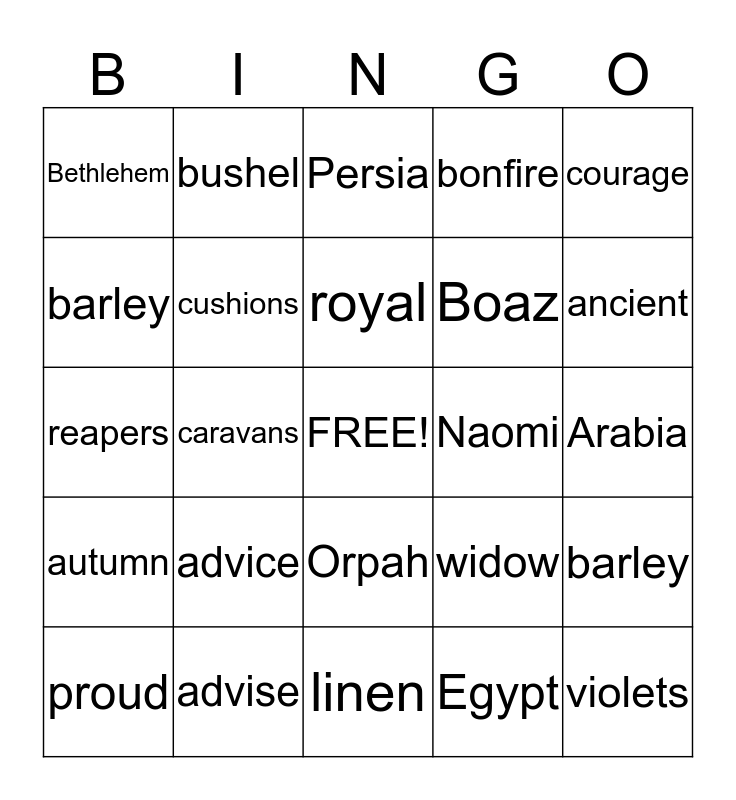 This bingo card has a free space and 24 words: advice, advise, royal, proud, courage, Bethlehem, barley, bushel, Naomi, Orpah, Boaz, reapers, widow, barley, cushions, Egypt, Arabia, Persia, ancient, caravans, violets, autumn, bonfire and linen.