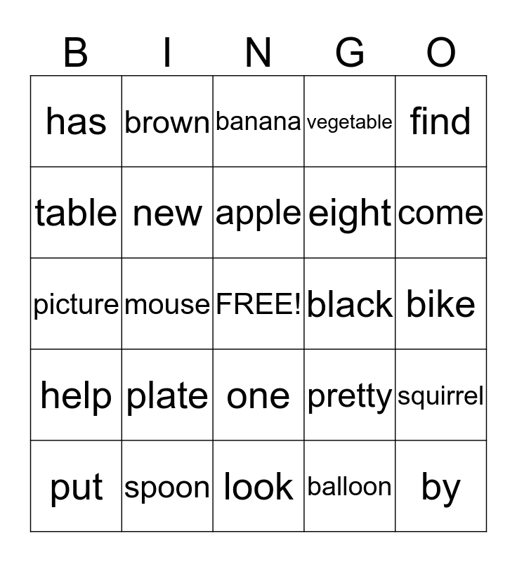 This bingo card has a free space and 24 words: plate, spoon, apple, put, find, has, table, brown, black, one, eight, picture, pretty, squirrel, new, balloon, bike, banana, come, mouse, by, help, vegetable and look.