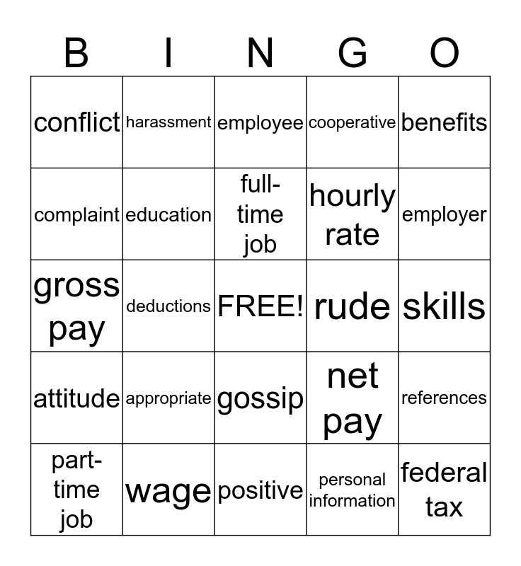 This bingo card has a free space and 24 words: appropriate, wage, full-time job, part-time job, benefits, conflict, complaint, harassment, rude, gossip, hourly rate, gross pay, net pay, references, education, personal information, skills, employee, employer, deductions, federal tax, attitude, cooperative and positive.