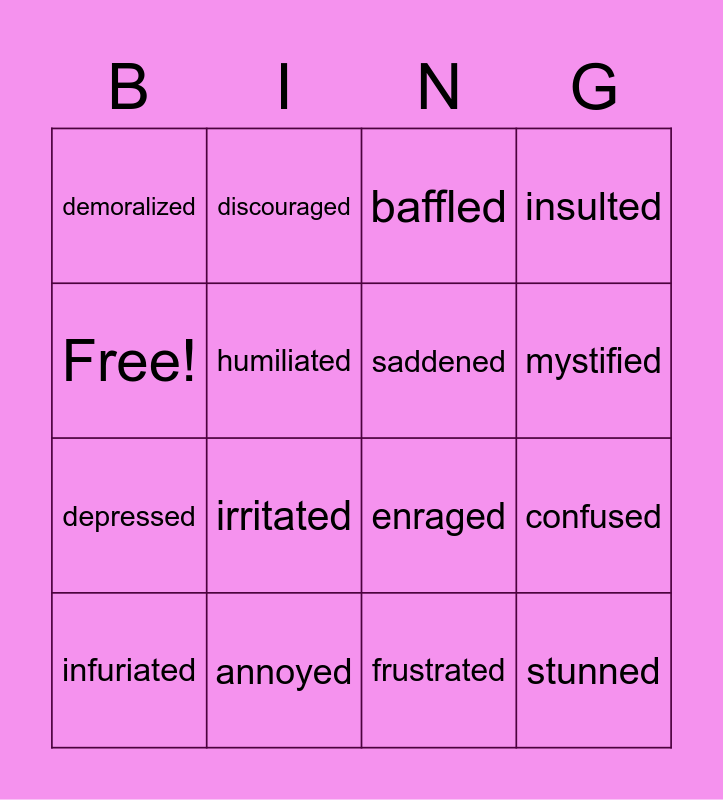 This bingo card has 16 words: annoyed, confused, baffled, demoralized, depressed, discouraged, enraged, frustrated, Free!, humiliated, infuriated, insulted, irritated, mystified, saddened and stunned.