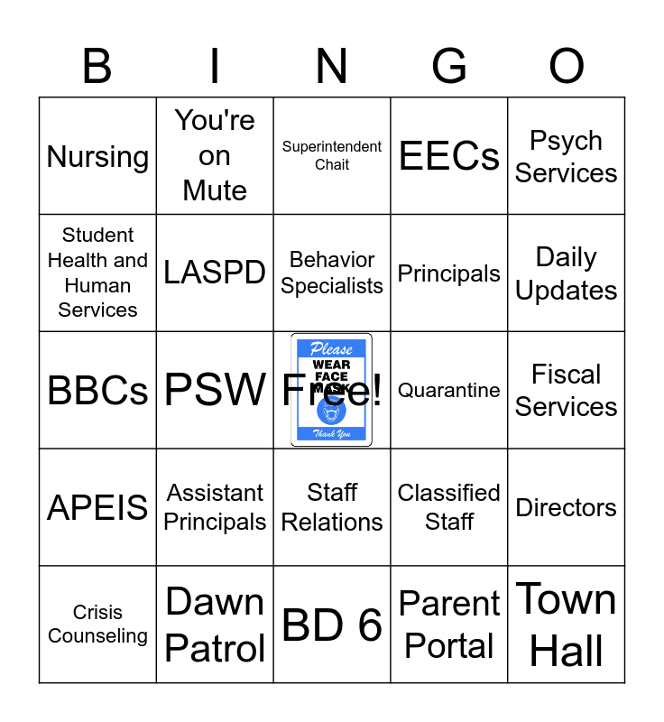 This bingo card has 1 images, a free space and 65 words: ISTAR, PACE, Professional Development, Directors, School Mental Health, Operations, You're on Mute, Special Education, Behavior Specialists, RJ Advisors, Staff Relations, Human Resources, Fiscal Services, Psych Services, PSA, Student Health and Human Services, PSW, Nursing, GATE Services, Principals, Assistant Principals, APEIS, EECs, Middle Schools, High Schools, Options, Elementary Schools, PESA, Town Hall, Zoom Meeting, Crisis Counseling, Self-Care, UTLA, AALA, Classified Staff, Dawn Patrol, Can You See my Screen, BBCs, Parent Portal, Daily Pass, LASPD, Covid-19 Test, Quarantine, Social Distance, Hot Spots, Chromebooks, Daily Updates, Sun Valley COS, Panorama City COS, Van Nuys/Valley Glen COS, Sunland/Tujunga COS, North Hollywood/Valley Village COS, San Fernando/Sylmar COS, Threat Assessment, Zoom-Bombing, Food Services, Facilities, Double Vaccinated, Superintendent Chait, BD 6, BD 3, Call Operations, Can You Hear Me?, Clerical Staff and Things Andres Says.