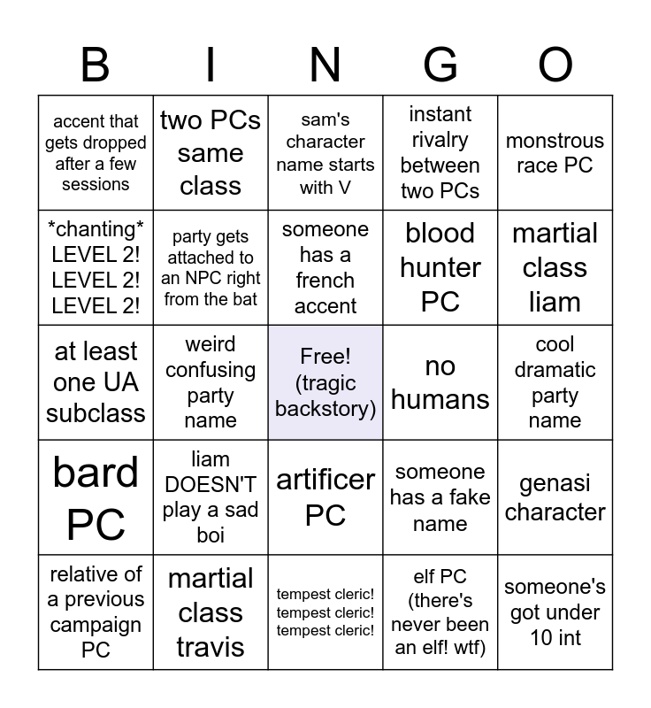 This bingo card has a free space and 24 words: liam DOESN'T play a sad boi, martial class travis, someone has a french accent, relative of a previous campaign PC, monstrous race PC, accent that gets dropped after a few sessions, *chanting* LEVEL 2! LEVEL 2! LEVEL 2!, two PCs same class, no humans, artificer PC, blood hunter PC, at least one UA subclass, someone has a fake name, genasi character, party gets attached to an NPC right from the bat, elf PC (there's never been an elf! wtf), cool dramatic party name, sam's character name starts with V, martial class liam, weird confusing party name, someone's got under 10 int, bard PC, instant rivalry between two PCs and tempest cleric! tempest cleric! tempest cleric!.