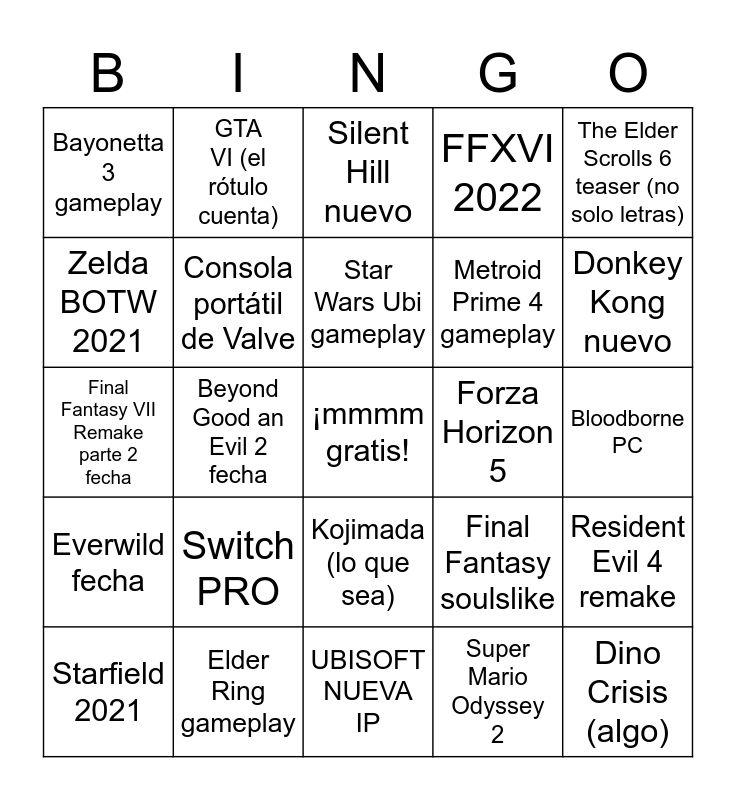 This bingo card has a free space and 24 words: Switch PRO, Elder Ring gameplay, Star Wars Ubi gameplay, Starfield 2021, The Elder Scrolls 6 teaser (no solo letras), Bayonetta 3 gameplay, Zelda BOTW 2021, GTA VI (el rótulo cuenta), Forza Horizon 5, Kojimada (lo que sea), Metroid Prime 4 gameplay, Final Fantasy VII Remake parte 2 fecha, Final Fantasy soulslike, Resident Evil 4 remake, Consola portátil de Valve, Super Mario Odyssey 2, Bloodborne PC, Silent Hill nuevo, Donkey Kong nuevo, Beyond Good an Evil 2 fecha, Dino Crisis (algo), Everwild fecha, FFXVI 2022 and UBISOFT NUEVA IP.
