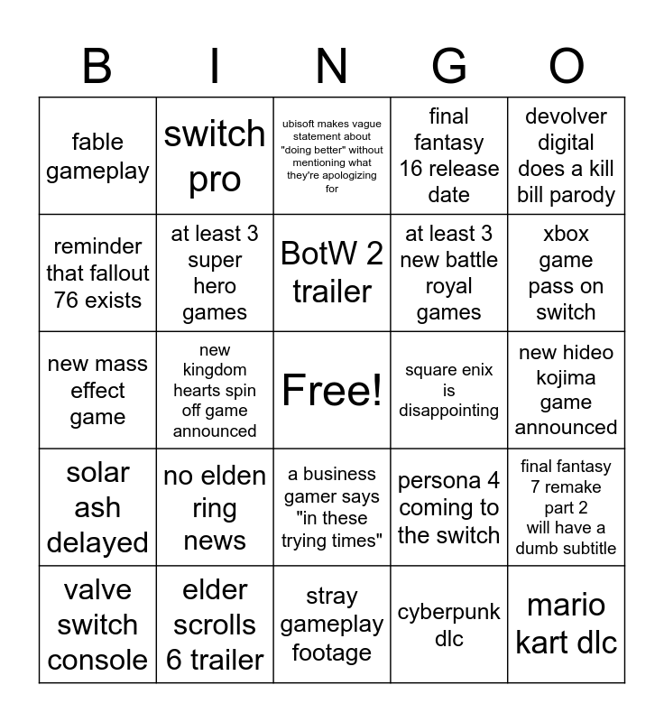 This bingo card has a free space and 24 words: no elden ring news, elder scrolls 6 trailer, BotW 2 trailer, valve switch console, devolver digital does a kill bill parody, fable gameplay, reminder that fallout 76 exists, switch pro, square enix is disappointing, a business gamer says "in these trying times", at least 3 new battle royal games, new mass effect game, persona 4 coming to the switch, final fantasy 7 remake part 2 will have a dumb subtitle, at least 3 super hero games, cyberpunk dlc, new hideo kojima game announced, ubisoft makes vague statement about "doing better" without mentioning what they're apologizing for, xbox game pass on switch, new kingdom hearts spin off game announced, mario kart dlc, solar ash delayed, final fantasy 16 release date and stray gameplay footage.