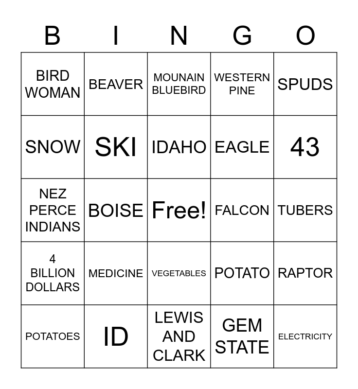 This bingo card has a free space and 24 words: MEDICINE, ID, IDAHO, POTATOES, SPUDS, BIRD WOMAN, SNOW, BEAVER, FALCON, VEGETABLES, EAGLE, NEZ PERCE INDIANS, POTATO, RAPTOR, SKI, GEM STATE, TUBERS, MOUNAIN BLUEBIRD, 43, BOISE, ELECTRICITY, 4 BILLION DOLLARS, WESTERN PINE and LEWIS AND CLARK.