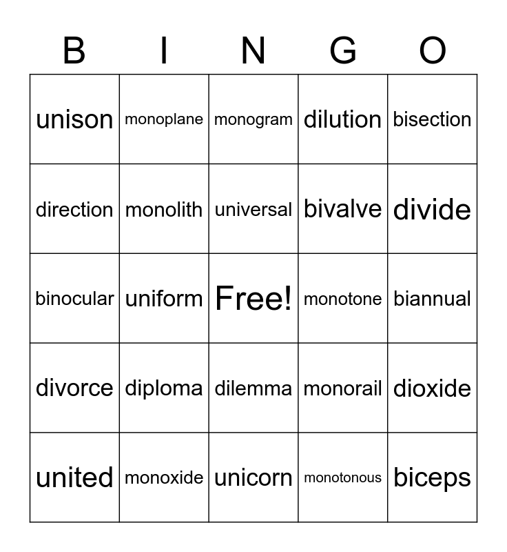 This bingo card has a free space and 31 words: unicorn, unicycle, uniform, unilateral, unison, monogram, monolith, monorail, monotone, monotonous, biannual, biceps, bicuspid, bicycle, divide, division, dioxide, diploma, divorce, dilemma, bisection, monograph, united, monoplane, bivalve, direction, dilution, binocular, monoxide, universal and monopoly.