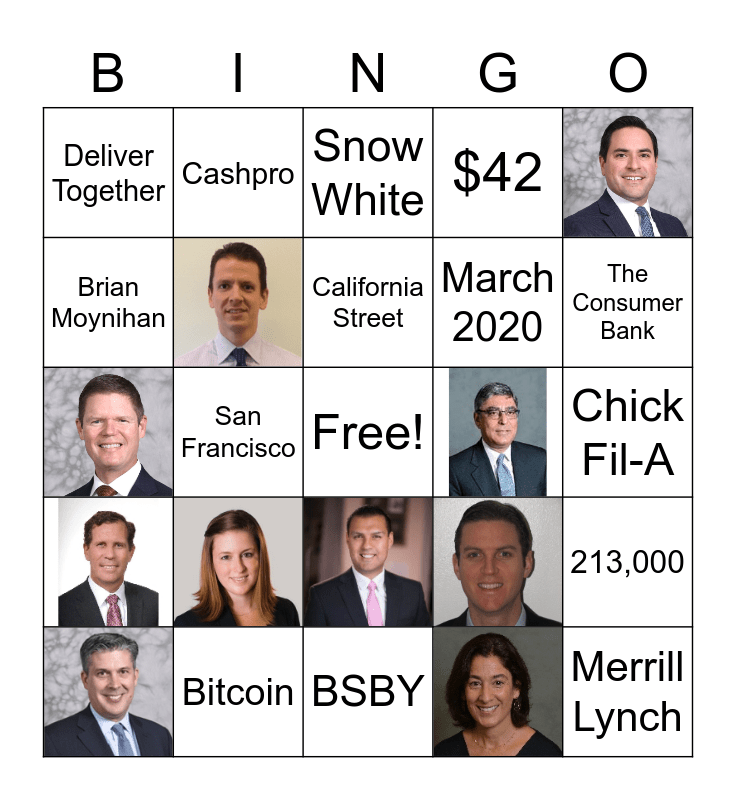 This bingo card has 13 images, a free space and 21 words: Bank of Italy, Cashpro, One Bryant Park, California Street, Snow White, 1904, The Consumer Bank, Bitcoin, Erica, Deliver Together, Chick Fil-A, BSBY, Merrill Lynch, $42, Pfizer, March 2020, Brian Moynihan, Charlotte, North Carolina, San Francisco, 213,000 and BAC.