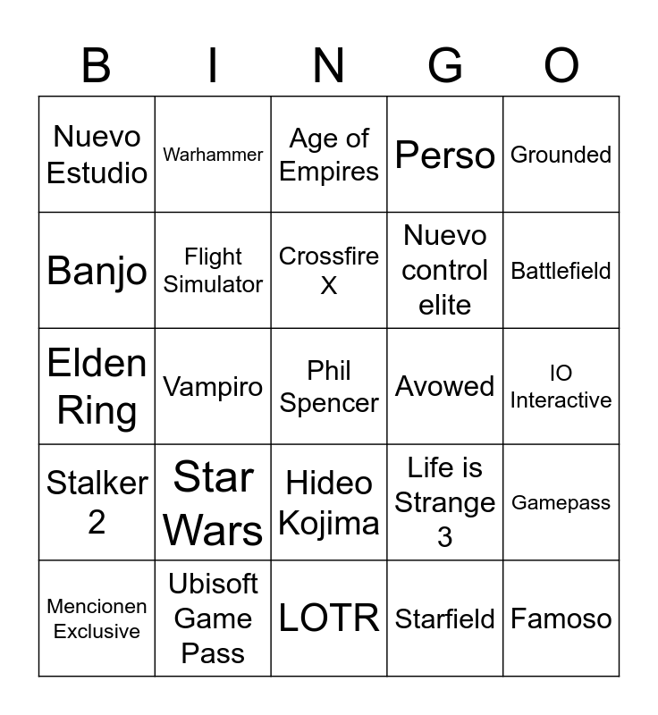 This bingo card has a free space and 34 words: Halo, Starfield, Psychonauts, The Gunk, Stalker 2, Flight Simulator, Grounded, Mencionen Exclusive, Warhammer, The Ascent, Crossfire X, Age of Empires, Forza Horizon, Hellblade, Avowed, Battlefield, Ubisoft Game Pass, Elden Ring, Star Wars, Life is Strange 3, Hideo Kojima, Wolfenstein 3, Nuevo Estudio, IO Interactive, LOTR, Famoso, Perso, Shadowdrop, Nuevo control elite, Banjo, Avalanche, Vampiro, Gamepass and Sea of Thieves.
