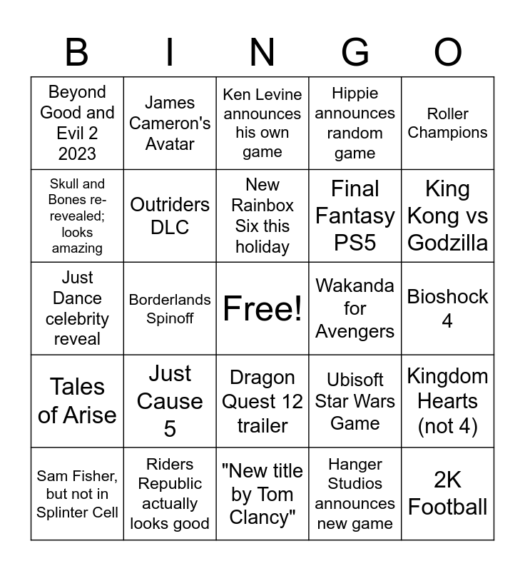 This bingo card has a free space and 24 words: Just Cause 5, Riders Republic actually looks good, New Rainbox Six this holiday, Sam Fisher, but not in Splinter Cell, Roller Champions, Beyond Good and Evil 2 2023, Skull and Bones re-revealed; looks amazing, James Cameron's Avatar, Wakanda for Avengers, Dragon Quest 12 trailer, Final Fantasy PS5, Just Dance celebrity reveal, Ubisoft Star Wars Game, Kingdom Hearts (not 4), Outriders DLC, Hanger Studios announces new game, Bioshock 4, Ken Levine announces his own game, King Kong vs Godzilla, Borderlands Spinoff, 2K Football, Tales of Arise, Hippie announces random game and "New title by Tom Clancy".