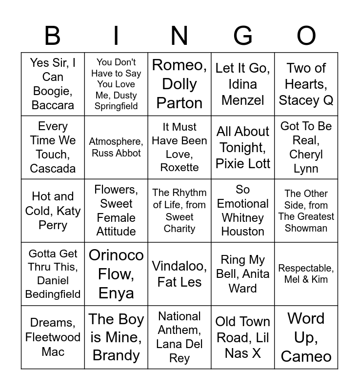 This bingo card has 40 words: Judas, Lady Gaga, Hot and Cold, Katy Perry, 212, Azealia Banks, Atmosphere, Russ Abbot, The Boy is Mine, Brandy, Vindaloo, Fat Les, It Must Have Been Love, Roxette, This is America, Childish Gambino, Two of Hearts, Stacey Q, Gotta Get Thru This, Daniel Bedingfield, Flowers, Sweet Female Attitude, Let It Go, Idina Menzel, The Rhythm of Life, from Sweet Charity, The Other Side, from The Greatest Showman, So Emotional Whitney Houston, Orinoco Flow, Enya, Chain Reaction, Steps, Yes Sir, I Can Boogie, Baccara, One Way or Another, Blondie, Romeo, Dolly Parton, Respectable, Mel & Kim, Old Town Road, Lil Nas X, All About Tonight, Pixie Lott, Every Time We Touch, Cascada, A Little Respect, Erasure, Kids in America, Kim Wilde, Human, The Killers, That Don't Impress Me Much, Shania Twain, Word Up, Cameo, I Believe in a Thing Called Love, The Darkness, Rasputin, Boney M, Dreams, Fleetwood Mac, Le Freak, CHIC, Ring My Bell, Anita Ward, Got To Be Real, Cheryl Lynn, National Anthem, Lana Del Rey, Born To Be Wild, Steppenwolf, Whatever Will Be, Will Be (Que Sera, Sera), Doris Day, You Don't Have to Say You Love Me, Dusty Springfield and Holding Out for a Hero, Bonnie Tyler.