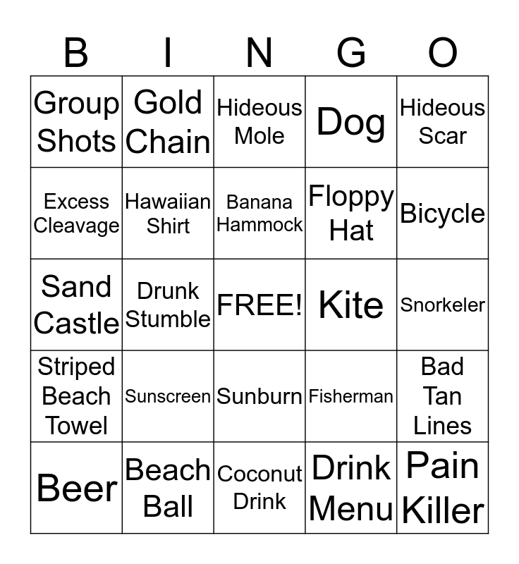 This bingo card has a free space and 24 words: Sunscreen, Beach Ball, Banana Hammock, Beer, Hideous Scar, Group Shots, Excess Cleavage, Gold Chain, Kite, Sunburn, Floppy Hat, Sand Castle, Fisherman, Bad Tan Lines, Hawaiian Shirt, Drink Menu, Snorkeler, Hideous Mole, Bicycle, Drunk Stumble, Pain Killer, Striped Beach Towel, Dog and Coconut Drink.
