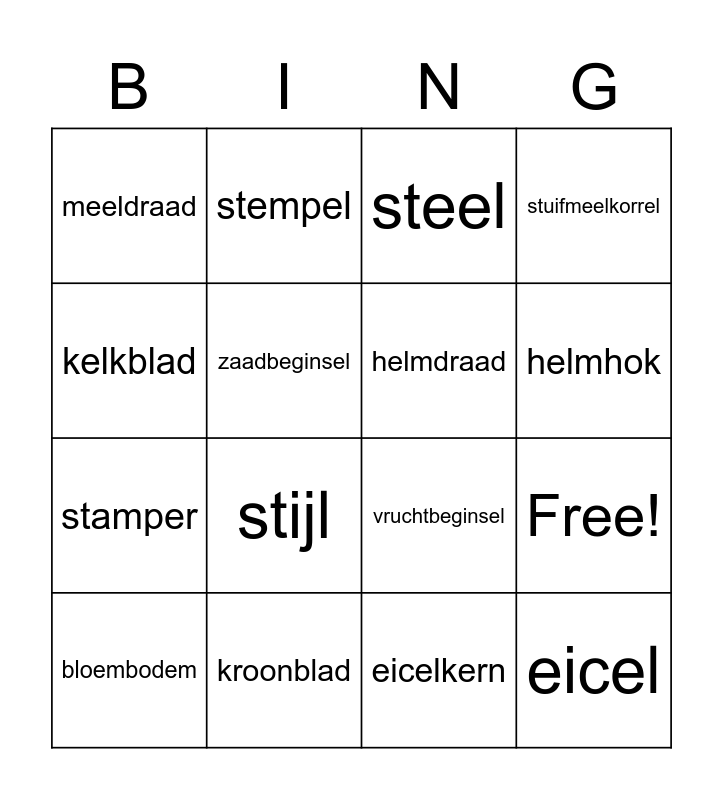This bingo card has 20 words: Free!, wortels, steel, blad, bloembodem, kelkblad, kroonblad, meeldraad, stamper, stempel, stijl, vruchtbeginsel, zaadbeginsel, eicel, helmdraad, helmknop, helmhok, stuifmeelkorrel, eicelkern and stuifmeelkorrelkern.