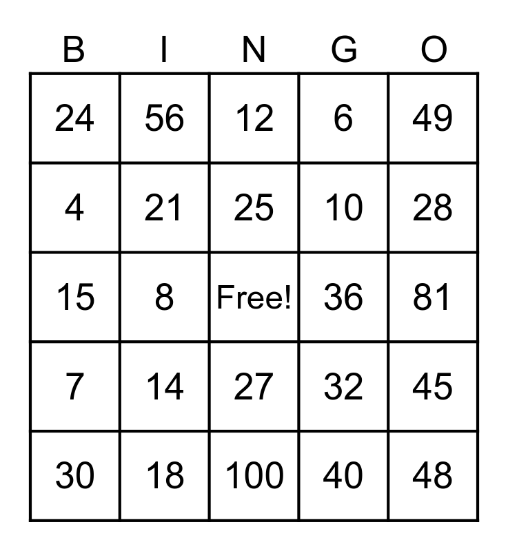This bingo card has a free space and 24 words: 14, 18, 25, 30, 49, 24, 4, 56, 36, 27, 10, 15, 32, 45, 21, 40, 81, 12, 28, 8, 48, 7, 6 and 100.