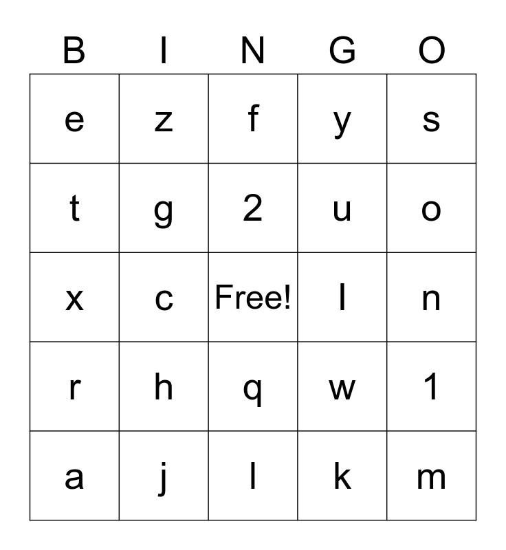 This bingo card has a free space and 29 words: a, b, c, d, e, f, g, h, I, j, n, m, l, k, o, p, q, r, s, x, w, v, u, t, y, z, 1, 2 and 3.