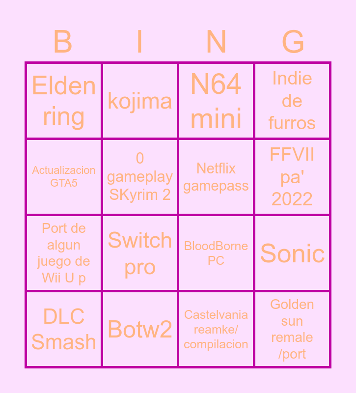 This bingo card has 16 words: Botw2, Sonic, N64 mini, Elden ring, Port de algun juego de Wii U p, kojima, BloodBorne PC, Castelvania reamke/ compilacion, Actualizacion GTA5, 0 gameplay SKyrim 2, DLC Smash, Indie de furros, Switch pro, FFVII pa' 2022, Netflix gamepass and Golden sun remale /port.