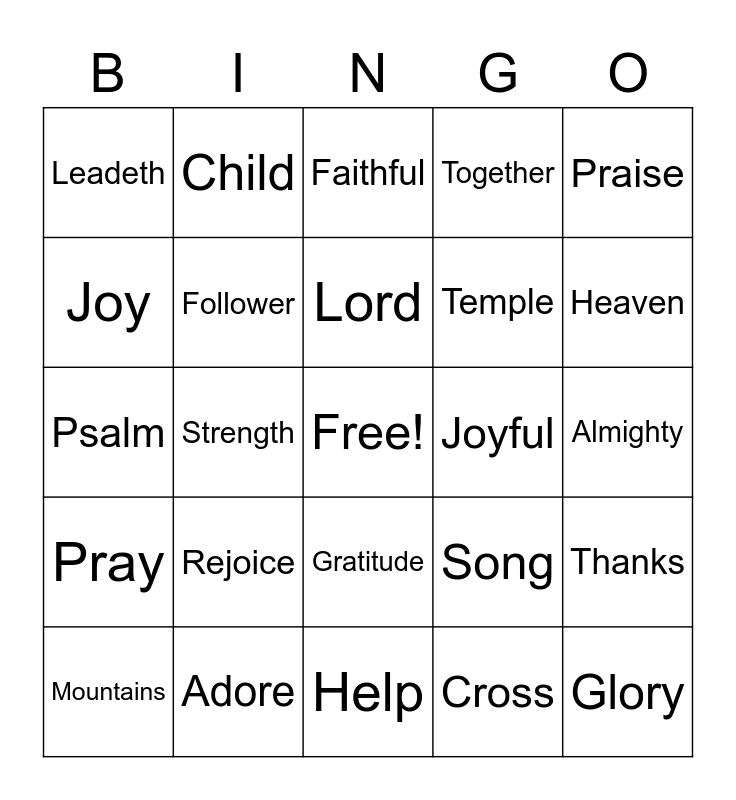 This bingo card has a free space and 29 words: Mountains, Refuge, Strength, Trouble, Leadeth, Faithful, Follower, Rejoice, Joyful, Adore, Almighty, Glory, Help, Cross, Heaven, Light, Gratitude, Pray, Praise, Psalm, Song, Sabbath, Temple, Joy, Together, Child, Thanks, Lord and Leadeth.
