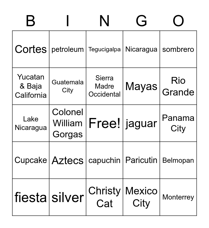 This bingo card has a free space and 24 words: Aztecs, silver, Sierra Madre Occidental, fiesta, sombrero, Cortes, Yucatan & Baja California, petroleum, jaguar, capuchin, Mayas, Lake Nicaragua, Paricutin, Belmopan, Guatemala City, Mexico City, Panama City, Tegucigalpa, Rio Grande, Colonel William Gorgas, Monterrey, Cupcake, Nicaragua and Christy Cat.