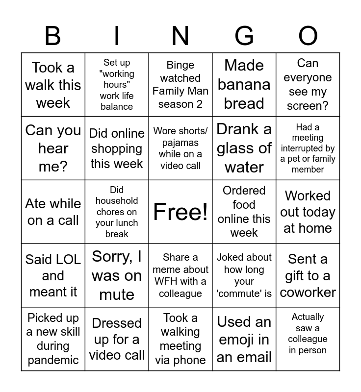 This bingo card has a free space and 24 words: Sorry, I was on mute, Dressed up for a video call, Wore shorts/ pajamas while on a video call, Picked up a new skill during pandemic, Can everyone see my screen?, Took a walk this week, Can you hear me?, Set up "working hours" work life balance, Ordered food online this week, Share a meme about WFH with a colleague, Drank a glass of water, Ate while on a call, Joked about how long your 'commute' is, Sent a gift to a coworker, Did online shopping this week, Used an emoji in an email, Worked out today at home, Binge watched Family Man season 2, Had a meeting interrupted by a pet or family member, Did household chores on your lunch break, Actually saw a colleague in person, Said LOL and meant it, Made banana bread and Took a walking meeting via phone.