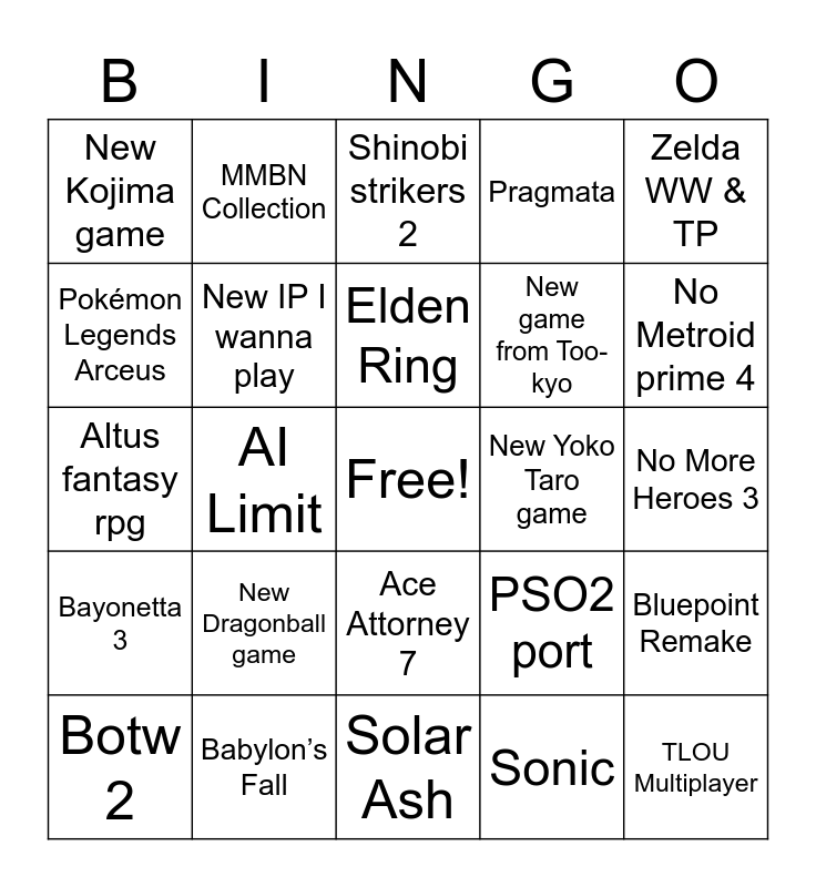 This bingo card has a free space and 24 words: New Dragonball game, Babylon’s Fall, Elden Ring, Botw 2, Zelda WW & TP, New Kojima game, Pokémon Legends Arceus, MMBN Collection, New Yoko Taro game, Ace Attorney 7, New game from Too-kyo, Altus fantasy rpg, PSO2 port, Bluepoint Remake, New IP I wanna play, Sonic, No More Heroes 3, Shinobi strikers 2, No Metroid prime 4, AI Limit, TLOU Multiplayer, Bayonetta 3, Pragmata and Solar Ash.