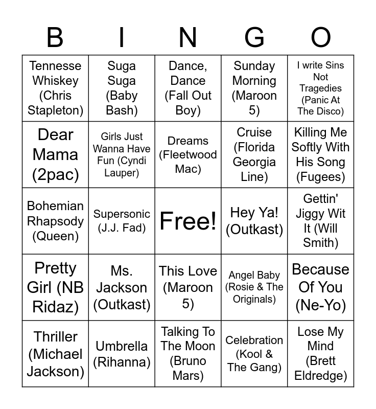 This bingo card has a free space and 39 words: Every Little Step (Bobby Brown), I Wanna Dance With Somebody (Whitney Houston), U Can't Touch This (MC Hammer), Angel Baby (Rosie & The Originals), Because Of You (Ne-Yo), Pretty Girl (NB Ridaz), Supersonic (J.J. Fad), I Will Survive (Gloria Gaynor), Hey Ya! (Outkast), Gettin' Jiggy Wit It (Will Smith), Dear Mama (2pac), Suga Suga (Baby Bash), Return of the Mack (Mark Morrison), Killing Me Softly With His Song (Fugees), Bohemian Rhapsody (Queen), Ms. Jackson (Outkast), This Love (Maroon 5), Sunday Morning (Maroon 5), Don't Stop Believin (Journey), Thriller (Michael Jackson), Girls Just Wanna Have Fun (Cyndi Lauper), Dreams (Fleetwood Mac), Celebration (Kool & The Gang), I write Sins Not Tragedies (Panic At The Disco), Crazy (Gnarls Barkley), Umbrella (Rihanna), Talking To The Moon (Bruno Mars), Stolen Dance (Milky Chance), Me and You (Brenton Wood), Tennesse Whiskey (Chris Stapleton), Ain't It Fun (Paramore), Do I Wanna Know? (Artic Monkeys), Cruise (Florida Georgia Line), Lose My Mind (Brett Eldredge), Your Man (Josh Turner), If I Ain't Got You (Alicia Keys), Dance, Dance (Fall Out Boy), Rhiannon (Fleetwood Mac) and Welcome to the Black Parade (My Chemical Romance).