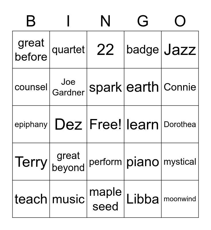 This bingo card has a free space and 24 words: great beyond, music, spark, teach, Jazz, great before, counsel, quartet, learn, perform, earth, epiphany, piano, mystical, Joe Gardner, Libba, Dorothea, 22, Connie, Dez, moonwind, Terry, badge and maple seed.