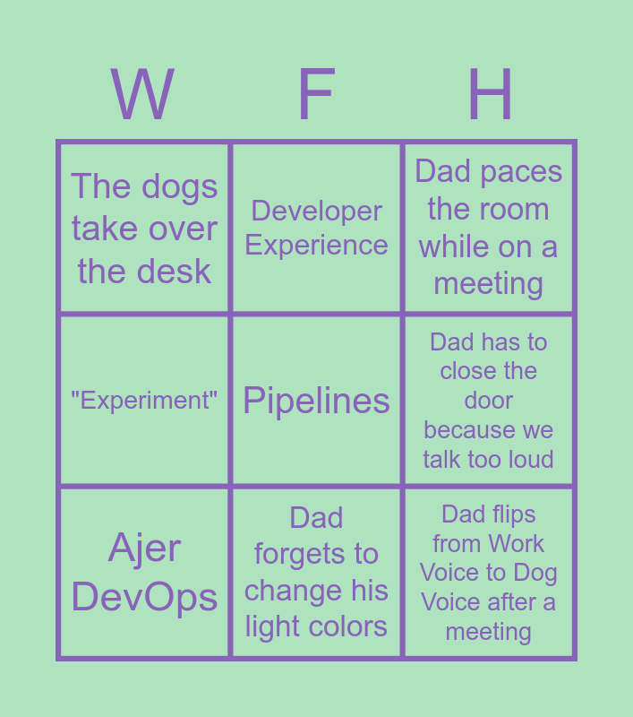 This bingo card has 13 words: Chris Thompson, Jake wants attention, Ajer DevOps, Developer Experience, "Experiment", Pipelines, Dad flips from Work Voice to Dog Voice after a meeting, Eddie squeaks his hedgehog during a meeting, Dad forgets to change his light colors, The dogs take over the desk, Dad has to close the door because we talk too loud, Dad paces the room while on a meeting and Dad has to pretend the person he's talking to isn't stupid (they are).