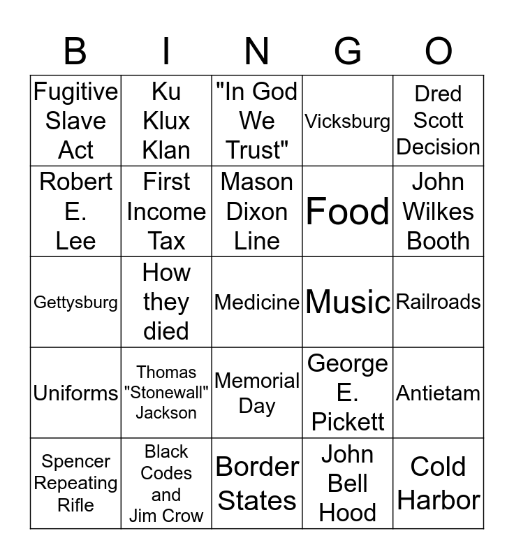 This bingo card has 25 words: Thomas "Stonewall" Jackson, Border States, Mason Dixon Line, Spencer Repeating Rifle, Dred Scott Decision, Fugitive Slave Act, Robert E. Lee, Ku Klux Klan, Music, Memorial Day, Food, Gettysburg, George E. Pickett, Antietam, First Income Tax, Cold Harbor, Railroads, "In God We Trust", John Wilkes Booth, How they died, Medicine, Black Codes and Jim Crow, Uniforms, Vicksburg and John Bell Hood.