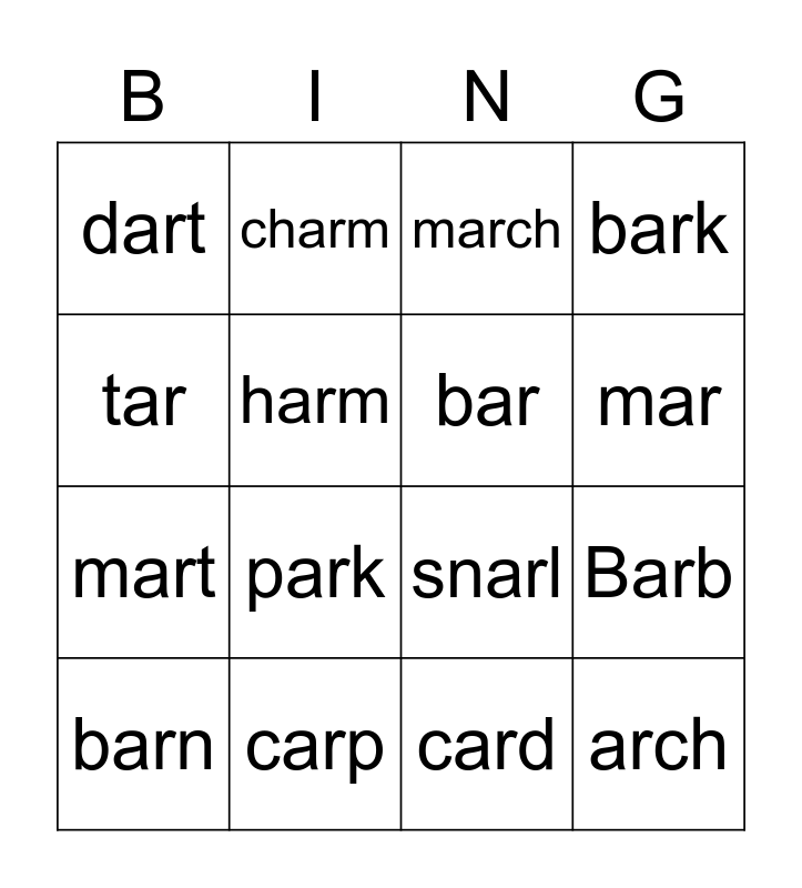 This bingo card has 39 words: arm, car, art, bar, far, jar, mar, par, tar, arch, Barb, bark, barn, card, carp, cart, dark, dart, farm, hard, harm, mark, mart, park, part, scar, star, tarp, tart, charm, chart, harsh, march, scarf, shark, sharp, smart, snarl and spark.
