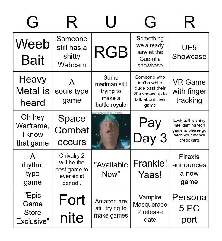 This bingo card has a free space and 24 words: Chivalry 2 will be the best game to ever exist period ., Fort nite, Some madman still trying to make a battle royale, "Epic Game Store Exclusive", UE5 Showcase, Weeb Bait, Heavy Metal is heard, Someone still has a shitty Webcam, Pay Day 3, "Available Now", Someone who isn't a white dude past their 20s shows up to talk about their game, Oh hey Warframe, I know that game, Frankie! Yaas!, Firaxis announces a new game, A souls type game, Vampire Masquerade 2 release date, Look at this shiny Intel gaming tech gamers, please go fetch your mom's credit card, RGB, VR Game with finger tracking, Space Combat occurs, Persona 5 PC port, A rhythm type game, Something we already saw at the Guerrilla showcase and Amazon are still trying to make games.