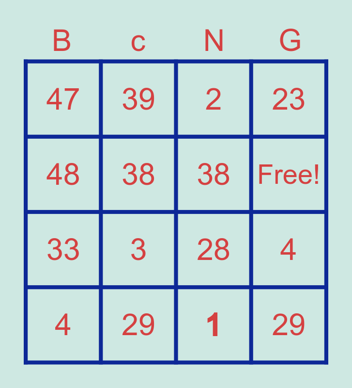 This bingo card has 17 words: 1, 4, 2, 47, 3, 23, 4, 38, Free!, 38, 29, 28, 48, 39, 33, 28 and 29.