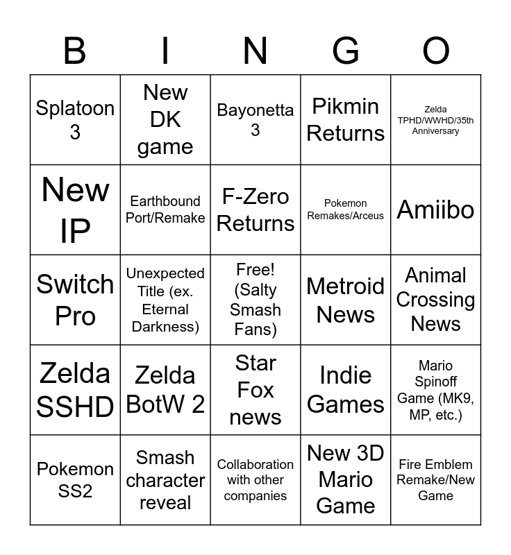 This bingo card has a free space and 24 words: Zelda BotW 2, Smash character reveal, F-Zero Returns, Pokemon SS2, Zelda TPHD/WWHD/35th Anniversary, Splatoon 3, New IP, New DK game, Metroid News, Star Fox news, Pokemon Remakes/Arceus, Switch Pro, Indie Games, Mario Spinoff Game (MK9, MP, etc.), Earthbound Port/Remake, New 3D Mario Game, Animal Crossing News, Bayonetta 3, Amiibo, Unexpected Title (ex. Eternal Darkness), Fire Emblem Remake/New Game, Zelda SSHD, Pikmin Returns and Collaboration with other companies.