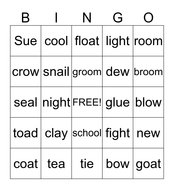 This bingo card has a free space and 24 words: clay, tea, groom, coat, room, Sue, crow, cool, glue, school, dew, seal, fight, new, snail, bow, blow, float, broom, night, goat, toad, light and tie.