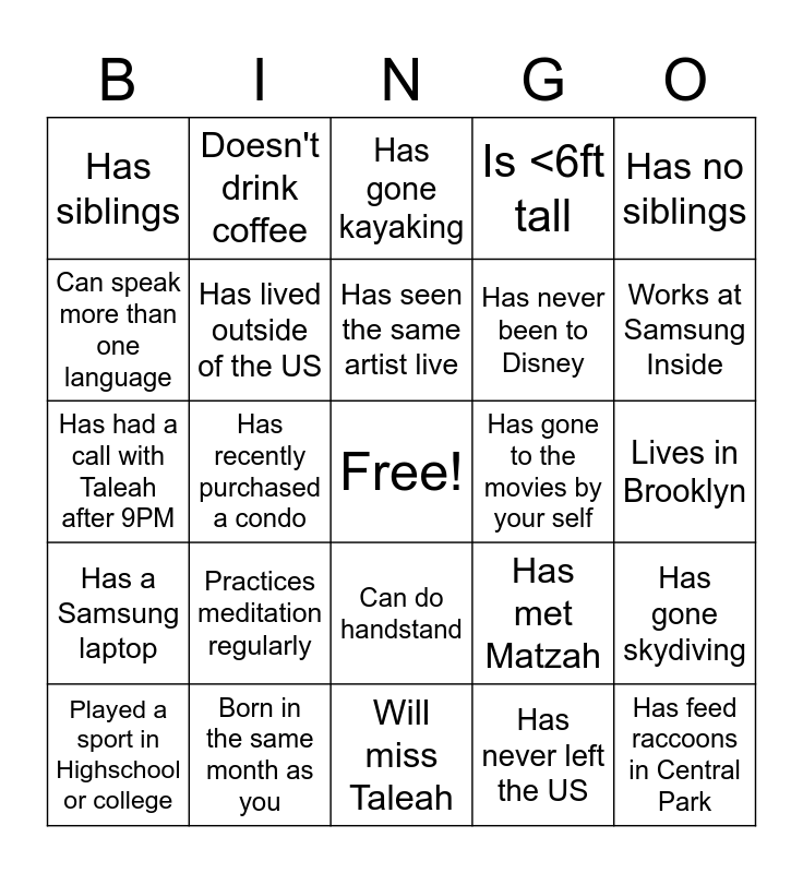 This bingo card has a free space and 24 words: Practices meditation regularly, Born in the same month as you, Has seen the same artist live, Played a sport in Highschool or college, Has no siblings, Has siblings, Can speak more than one language, Doesn't drink coffee, Has gone to the movies by your self, Can do handstand, Has never been to Disney, Has had a call with Taleah after 9PM, Has met Matzah, Has gone skydiving, Has lived outside of the US, Has never left the US, Lives in Brooklyn, Has gone kayaking, Works at Samsung Inside, Has recently purchased a condo, Has feed raccoons in Central Park, Has a Samsung laptop, Is <6ft tall and Will miss Taleah.