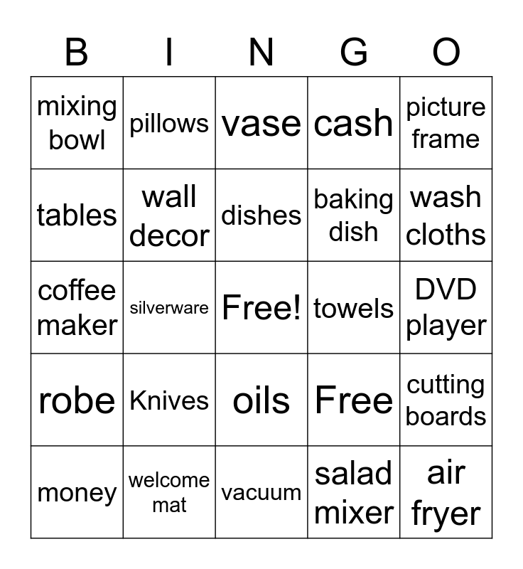 This bingo card has a free space and 25 words: Knives, vacuum, dishes, money, picture frame, mixing bowl, tables, pillows, towels, oils, baking dish, coffee maker, Free, cutting boards, wall decor, TV, DVD player, vase, wash cloths, silverware, air fryer, welcome mat, robe, cash and salad mixer.