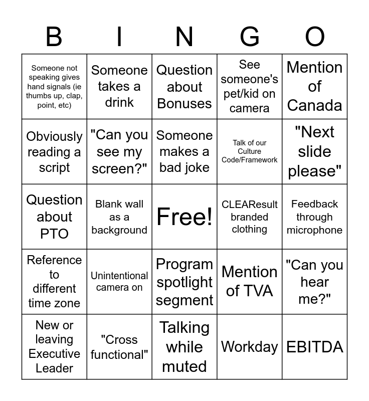 This bingo card has a free space and 24 words: Unintentional camera on, "Cross functional", Someone makes a bad joke, New or leaving Executive Leader, Mention of Canada, Someone not speaking gives hand signals (ie thumbs up, clap, point, etc), Obviously reading a script, Someone takes a drink, CLEAResult branded clothing, Program spotlight segment, Talk of our Culture Code/Framework, Question about PTO, Mention of TVA, "Can you hear me?", "Can you see my screen?", Workday, Feedback through microphone, Question about Bonuses, "Next slide please", Blank wall as a background, EBITDA, Reference to different time zone, See someone's pet/kid on camera and Talking while muted.