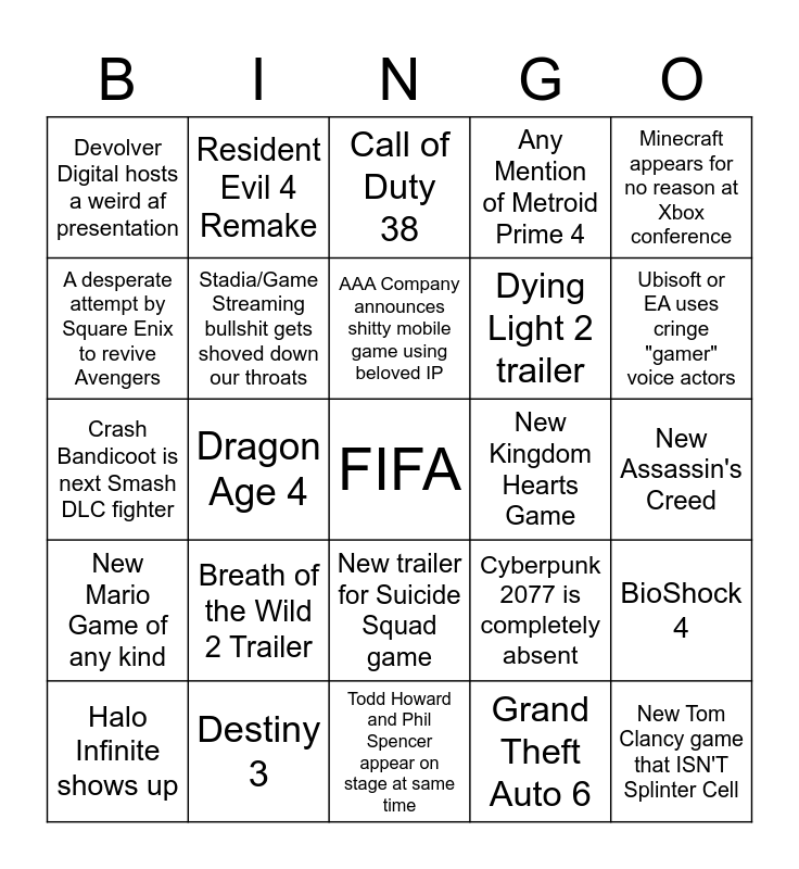 This bingo card has a free space and 24 words: Breath of the Wild 2 Trailer, Destiny 3, AAA Company announces shitty mobile game using beloved IP, Halo Infinite shows up, Minecraft appears for no reason at Xbox conference, Devolver Digital hosts a weird af presentation, A desperate attempt by Square Enix to revive Avengers, Resident Evil 4 Remake, New Kingdom Hearts Game, New trailer for Suicide Squad game, Dying Light 2 trailer, Crash Bandicoot is next Smash DLC fighter, Cyberpunk 2077 is completely absent, BioShock 4, Stadia/Game Streaming bullshit gets shoved down our throats, Grand Theft Auto 6, New Assassin's Creed, Call of Duty 38, Ubisoft or EA uses cringe "gamer" voice actors, Dragon Age 4, New Tom Clancy game that ISN'T Splinter Cell, New Mario Game of any kind, Any Mention of Metroid Prime 4 and Todd Howard and Phil Spencer appear on stage at same time.