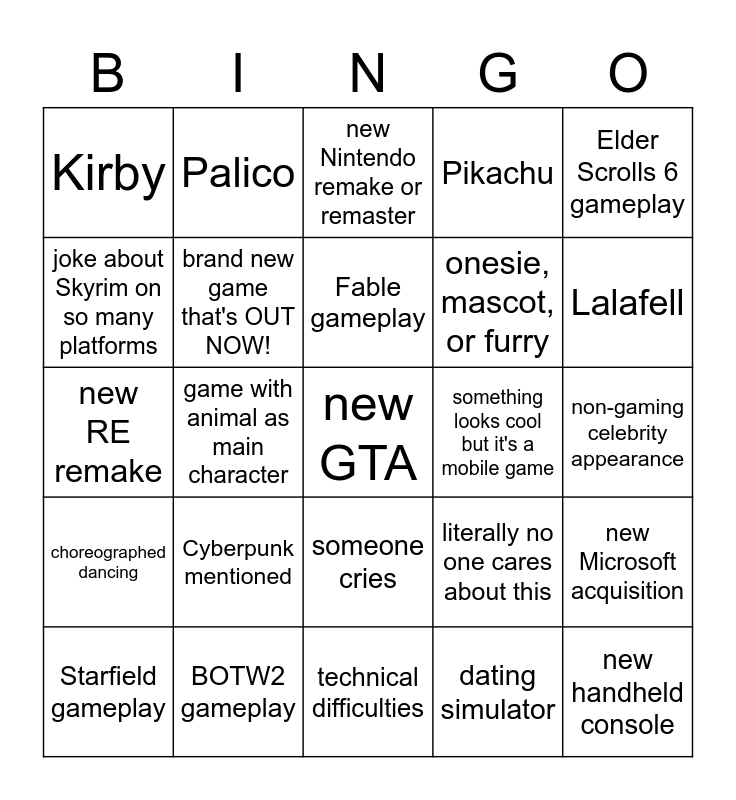 This bingo card has 25 words: Cyberpunk mentioned, technical difficulties, Fable gameplay, Starfield gameplay, Elder Scrolls 6 gameplay, Kirby, joke about Skyrim on so many platforms, Palico, something looks cool but it's a mobile game, someone cries, onesie, mascot, or furry, new RE remake, literally no one cares about this, new Microsoft acquisition, brand new game that's OUT NOW!, new handheld console, non-gaming celebrity appearance, new Nintendo remake or remaster, Lalafell, game with animal as main character, new GTA, BOTW2 gameplay, choreographed dancing, Pikachu and dating simulator.