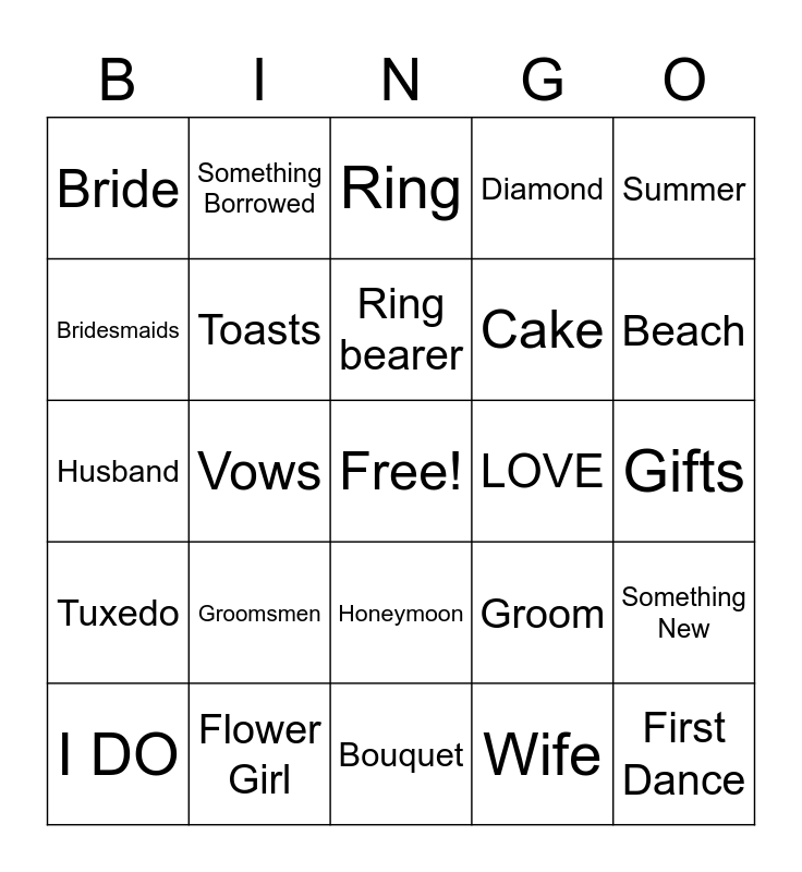This bingo card has a free space and 32 words: Wife, Wedding Dress, Vows, Veil, Tuxedo, Toasts, Summer, Something New, Something Borrowed, Something Blue, Ring bearer, Ring, Reception, Maid of Honor, LOVE, Kiss, I DO, Husband, Honeymoon, Groomsmen, Groom, Gown, Gifts, Flower Girl, First Dance, Diamond, Cake, Bridesmaids, Bride, Bouquet, Best Man and Beach.