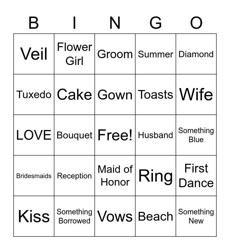 This bingo card has a free space and 32 words: Beach, Best Man, Bouquet, Bride, Bridesmaids, Cake, Diamond, First Dance, Flower Girl, Gifts, Gown, Groom, Groomsmen, Honeymoon, Husband, I DO, Kiss, LOVE, Maid of Honor, Reception, Ring, Ring bearer, Something Blue, Something Borrowed, Something New, Summer, Toasts, Tuxedo, Veil, Vows, Wedding Dress and Wife.