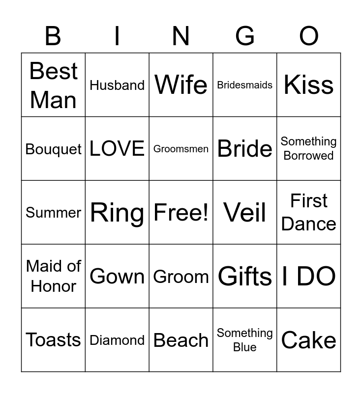 This bingo card has a free space and 32 words: Something Blue, Ring bearer, Ring, Reception, Maid of Honor, LOVE, Kiss, I DO, Husband, Honeymoon, Groomsmen, Wife, Wedding Dress, Vows, Veil, Tuxedo, Toasts, Summer, Groom, Gown, Gifts, Flower Girl, First Dance, Diamond, Cake, Bridesmaids, Bride, Bouquet, Best Man, Beach, Something New and Something Borrowed.