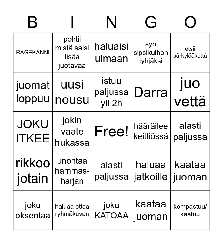 This bingo card has a free space and 24 words: unohtaa hammas-harjan, haluaa ottaa ryhmäkuvan, istuu paljussa yli 2h, joku oksentaa, etsii särkylääkettä, RAGEKÄNNI, juomat loppuu, pohtii mistä saisi lisää juotavaa, hääräilee keittiössä, alasti paljussa, Darra, JOKU ITKEE, haluaa jatkoille, kaataa juoman, uusi nousu, kaataa juoman, alasti paljussa, haluaisi uimaan, juo vettä, jokin vaate hukassa, kompastuu/ kaatuu, rikkoo jotain, syö sipsikulhon tyhjäksi and joku KATOAA.