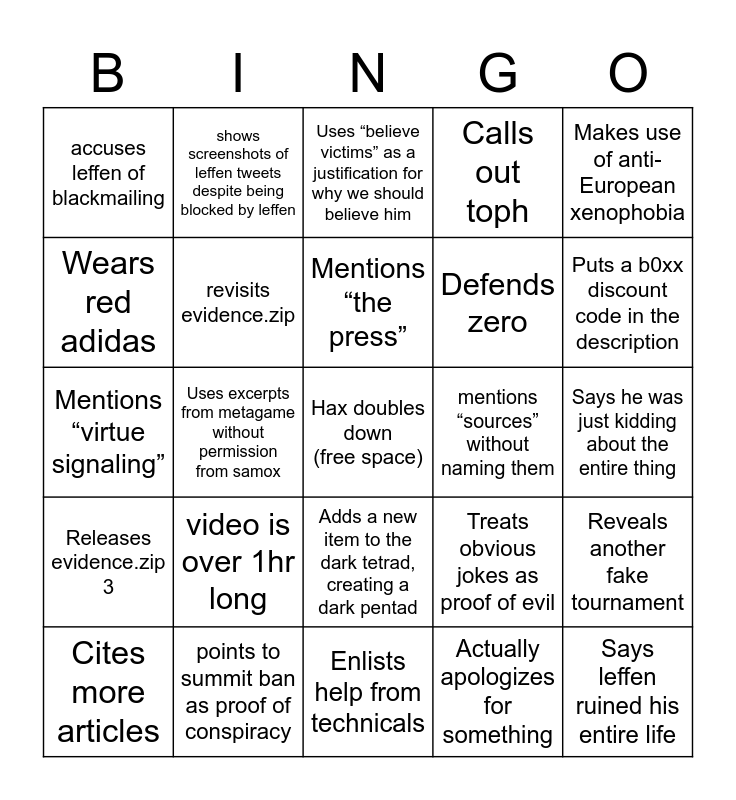 This bingo card has a free space and 24 words: video is over 1hr long, points to summit ban as proof of conspiracy, Mentions “the press”, Cites more articles, Makes use of anti-European xenophobia, accuses leffen of blackmailing, Wears red adidas, shows screenshots of leffen tweets despite being blocked by leffen, mentions “sources” without naming them, Adds a new item to the dark tetrad, creating a dark pentad, Defends zero, Mentions “virtue signaling”, Treats obvious jokes as proof of evil, Reveals another fake tournament, revisits evidence.zip, Actually apologizes for something, Says he was just kidding about the entire thing, Uses “believe victims” as a justification for why we should believe him, Puts a b0xx discount code in the description, Uses excerpts from metagame without permission from samox, Says leffen ruined his entire life, Releases evidence.zip 3, Calls out toph and Enlists help from technicals.