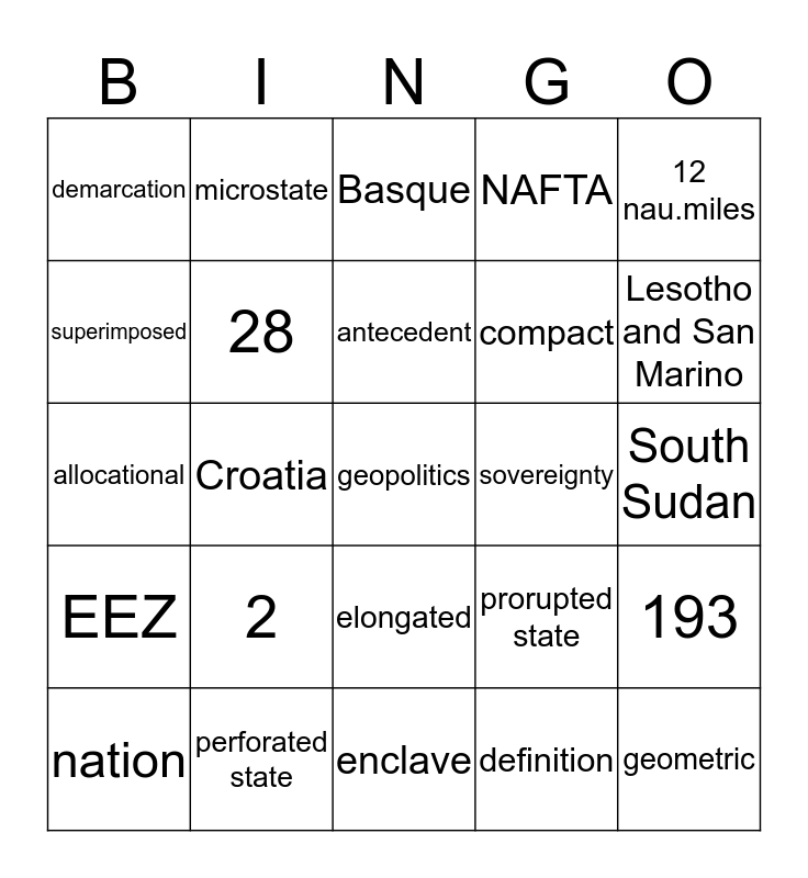 This bingo card has a free space and 24 words: 2, perforated state, antecedent, nation, 12 nau.miles, demarcation, superimposed, microstate, sovereignty, elongated, compact, allocational, prorupted state, 193, 28, definition, South Sudan, Basque, Lesotho and San Marino, Croatia, geometric, EEZ, NAFTA and enclave.